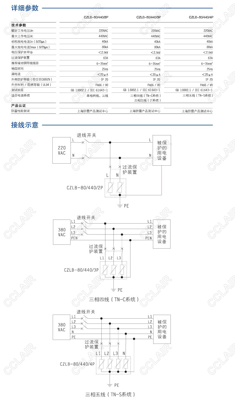 CZLB-80/440/2P,CZLB-80/440/3P,CZLB-80/440/4P 交流電源型SPD(80kA)
