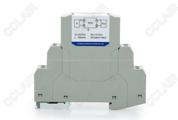 24V信號SPD,三線制,適用于線對地隔離電壓>500V信號回路,最大放電電流Imax(8/20us):20kA/線,12.5mm超薄,通過DIN35金屬導軌接地。
