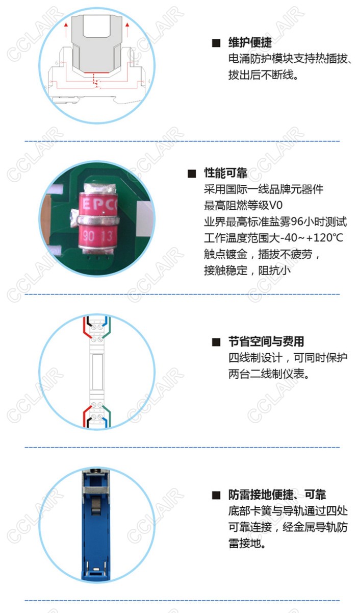 24V信號SPD,四線制,本安型,適用于線對地隔離電壓>500V信號回路,最大放電電流Imax(8/20us):20kA/線,12.5mm超薄,通過DIN35金屬導軌接地。