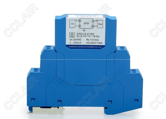 24V信號SPD,三線制,本安型,適用于線對地隔離電壓>500V信號回路,最大放電電流Imax(8/20us):20kA/線,12.5mm超薄,通過DIN35金屬導軌接地。