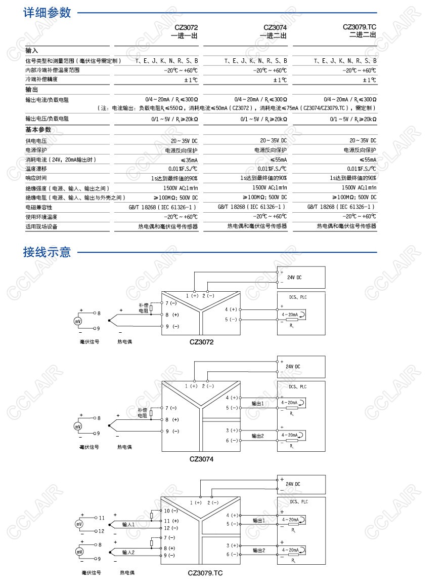 信號類型和測量范圍可編程,PT100冷端傳感器,高精度自動冷端補(bǔ)償,超量程、斷線檢測與報(bào)警功能。 CZ3074 一進(jìn)二出 熱電偶輸入隔離器 信號類型和測量范圍可編程,PT100冷端傳感器,高精度自動冷端補(bǔ)償,超量程、斷線檢測與報(bào)警功能。 CZ3072 一進(jìn)一出 熱電偶輸入隔離器 信號類型和測量范圍可編程,PT100冷端傳感器,高精度自動冷端補(bǔ)償,超量程、斷線檢測與報(bào)警功能。