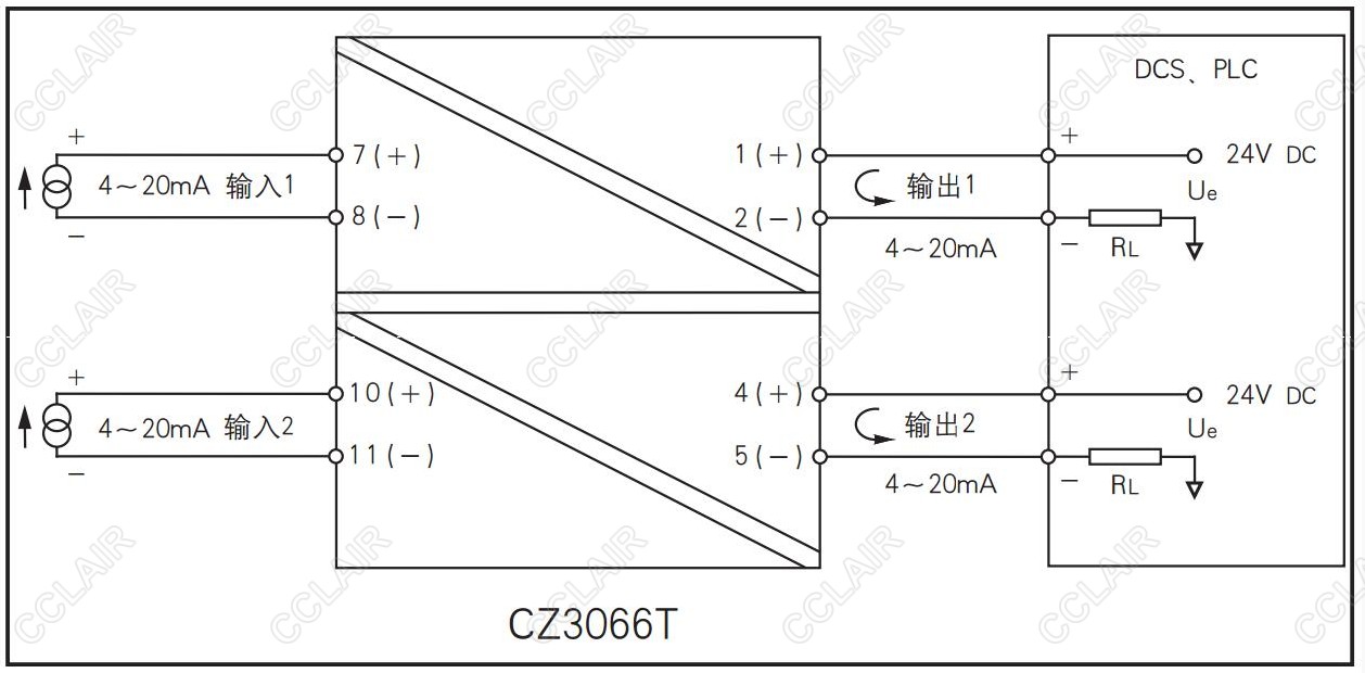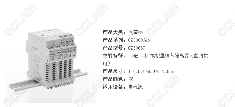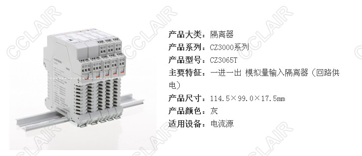 CZ3065T 一進(jìn)一出 模擬量輸入、輸出隔離器(回路供電) 適用于電流源信號(hào)輸入,輸出回路供電,無(wú)需獨(dú)立電源供電。 CZ3066T 二進(jìn)二出 模擬量輸入、輸出隔離器(回路供電) 適用于電流源信號(hào)輸入,輸出回路供電,無(wú)需獨(dú)立電源供電.