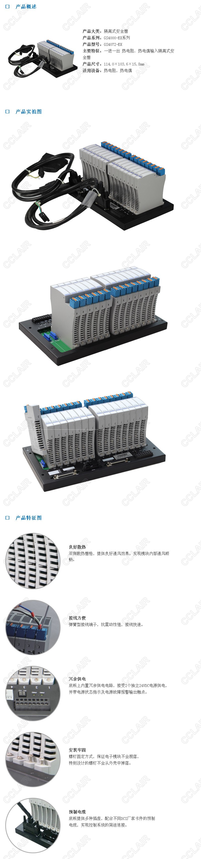 GS4072-EX熱電阻、熱電偶輸入型底板式隔離柵,將現(xiàn)場(chǎng)的熱電阻、熱電偶信號(hào)轉(zhuǎn)換成0/4~20mA或1~5V信號(hào),從危險(xiǎn)側(cè)隔離傳輸?shù)桨踩珎?cè)。它具有冷端補(bǔ)償?shù)墓δ?,是智能型安全柵,可通過(guò)計(jì)算機(jī)對(duì)熱電偶的分度號(hào)、量程范圍等進(jìn)行組態(tài),同時(shí)可對(duì)上下限及斷線報(bào)警輸出電流值進(jìn)行設(shè)定。該產(chǎn)品需要獨(dú)立供電,電源、輸入和輸出三隔離。