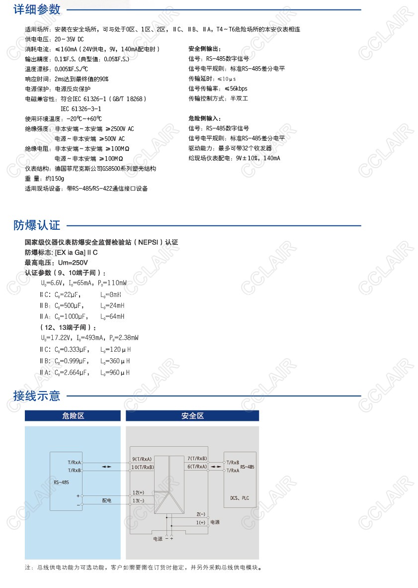 實現(xiàn)RS-485數(shù)字信號在危險區(qū)和安全區(qū)的雙向通信,并給現(xiàn)場儀表提供隔離電源。該產(chǎn)品需要獨立供電,電源、輸入和輸出三隔離。