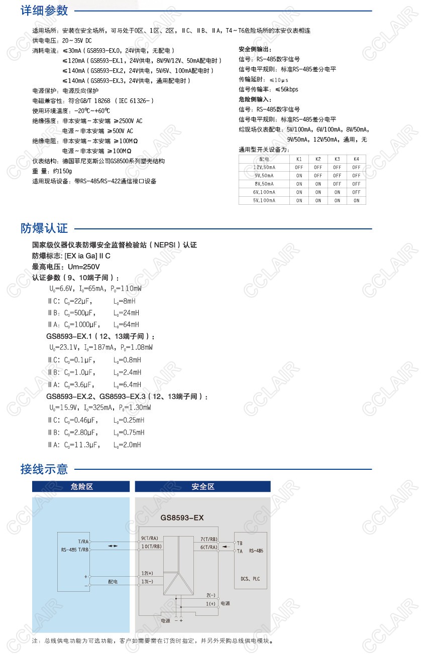 8V/9V/12V、50mA配電;該產(chǎn)品需要獨(dú)立供電,電源、輸入和輸出三隔離。實(shí)現(xiàn)RS-485數(shù)字信號在危險(xiǎn)區(qū)和安全區(qū)的雙向通信,并給現(xiàn)場儀表提供隔離電源