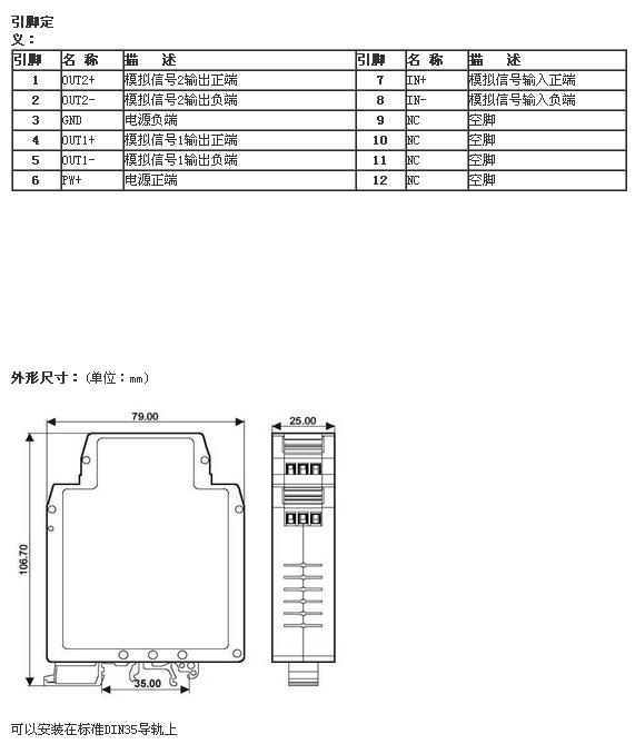 標(biāo)準(zhǔn)DIN35 導(dǎo)軌式安裝(尺寸:106.7x79.0x25.0mm)