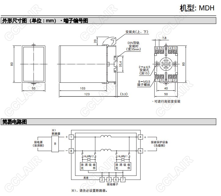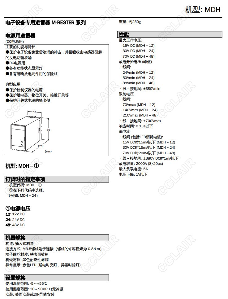 MDH-12/MDH-24/MDH-48,直流電源用 最大負(fù)載5A 插入型避雷器