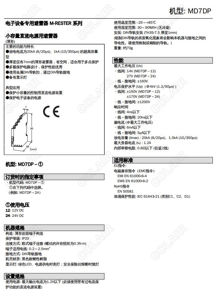 MD7DP-12/MD7DP-24,直流電源用 最大負(fù)載1.2A 超薄型避雷器