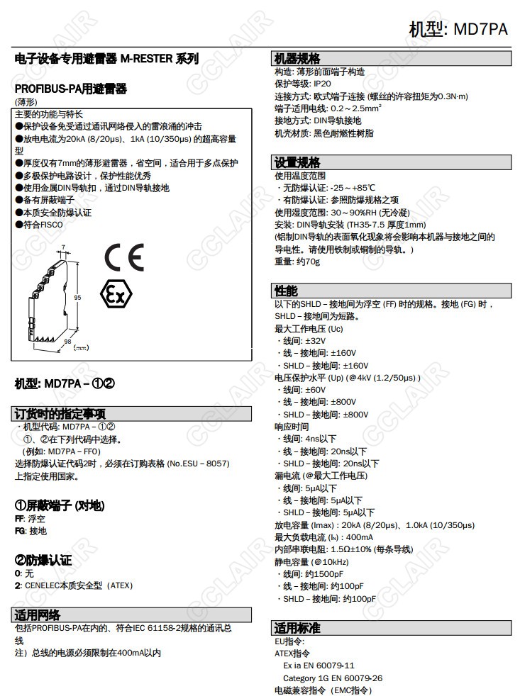 MD7PA, MD7PA-FF0,MD7PA-FF2,MD7PA-FG0,MD7PA-FG2, PROFIBUS-PA用 超薄型避雷器