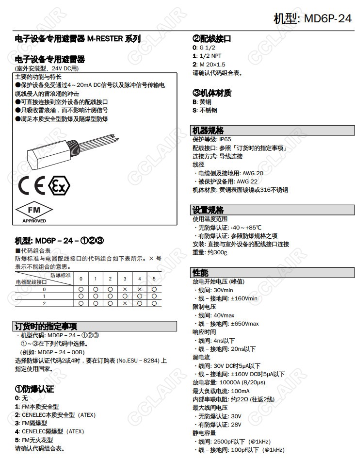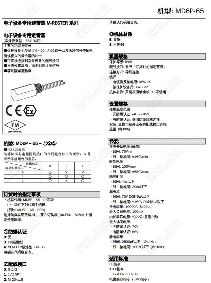 MD6P-24/MD6P-65,MD6P-24-00B,4-20mA直流、脈沖信號(hào)用 室外安裝型 引線(xiàn)連接型 堵頭型,避雷器