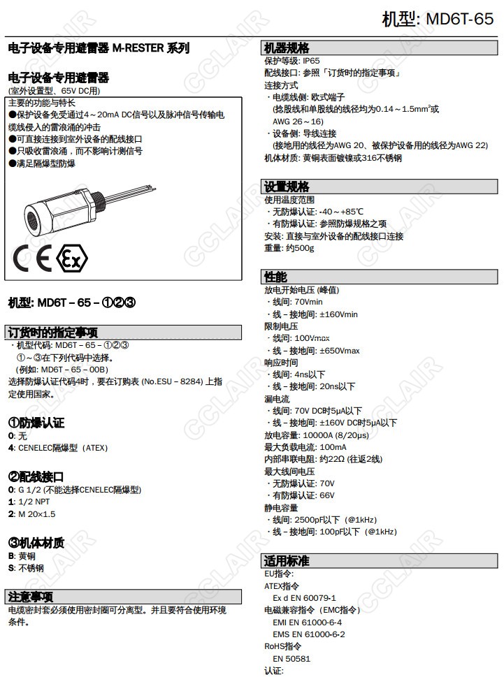 MD6T-24/MD6T-65,MD6T-24-00B,MD6T-24-1,4-20mA直流、脈沖信號用 室外安裝型 端子臺連接型避雷器