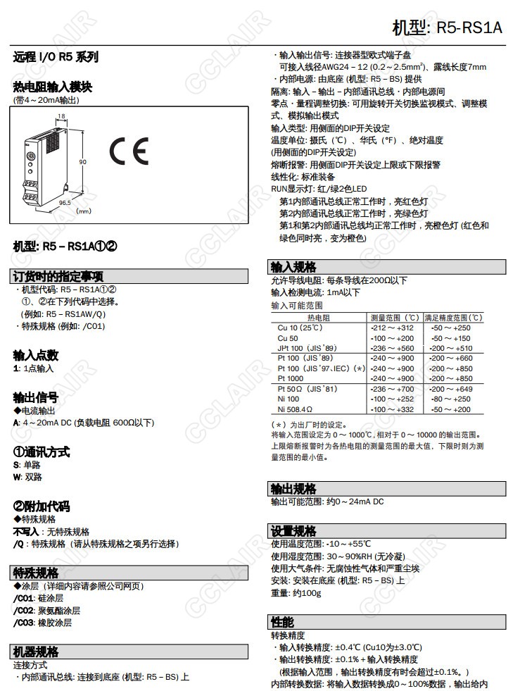 R5-RS1A,熱電阻信號輸入,輸入信號∶Pt100, Pt1000, Pt50, Ni100, Ni508.4, Cu10, Cu50,輸出信號∶DC4~20mA