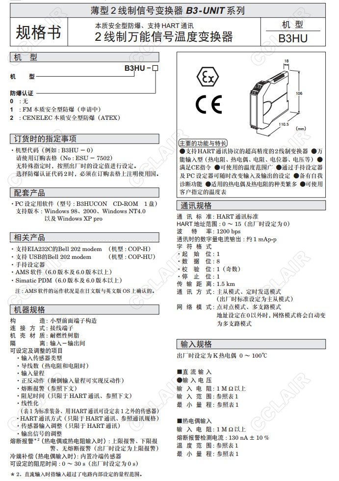 B3HU,B3HU-0,B3HU-1,B3HU-2,2線制萬能信號(hào)溫度變換器(本質(zhì)安全型防爆、支持HART通訊)
