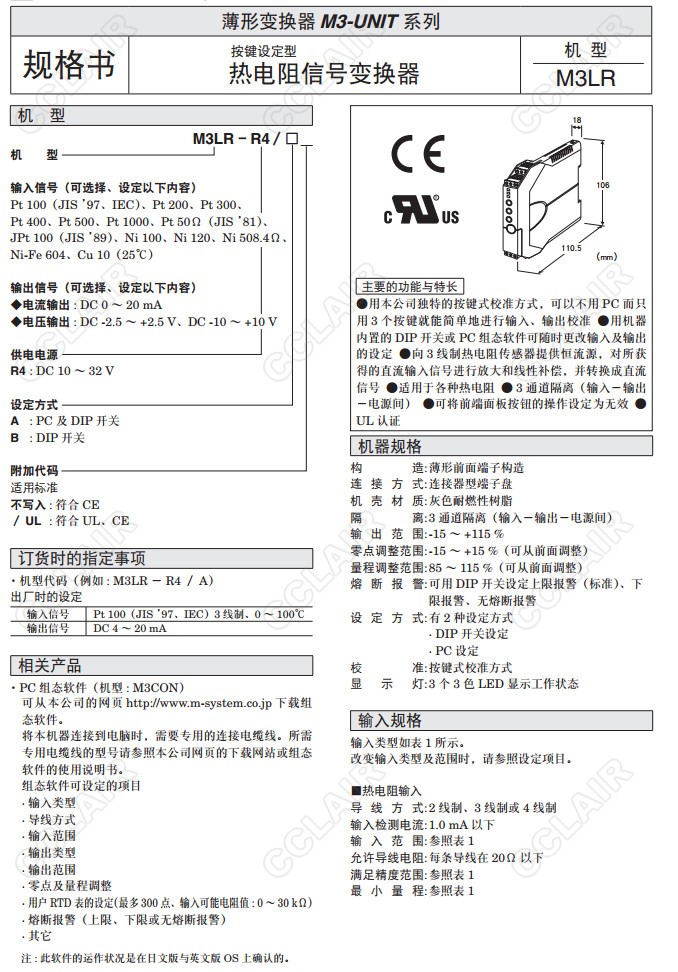M3LR,M3LR-R4/A,M3LR-R4/B,M3LR-R4/A/UL,M3LR-R4/B/UL,熱電阻信號變換器(按鍵設(shè)定型)