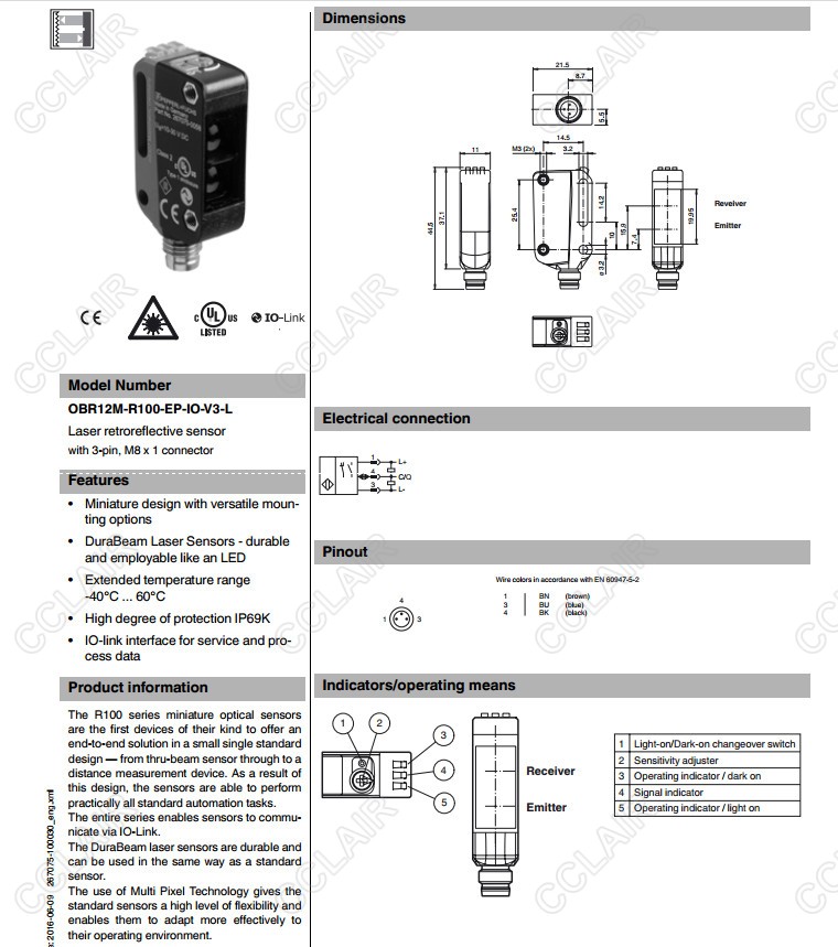 OBR12M-R100-EP-IO-V3-L,反射板型傳感器