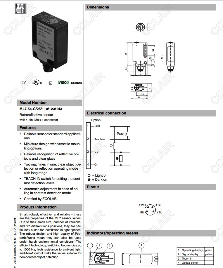 ML7-54-G/25/110/123/143,反射板型傳感器