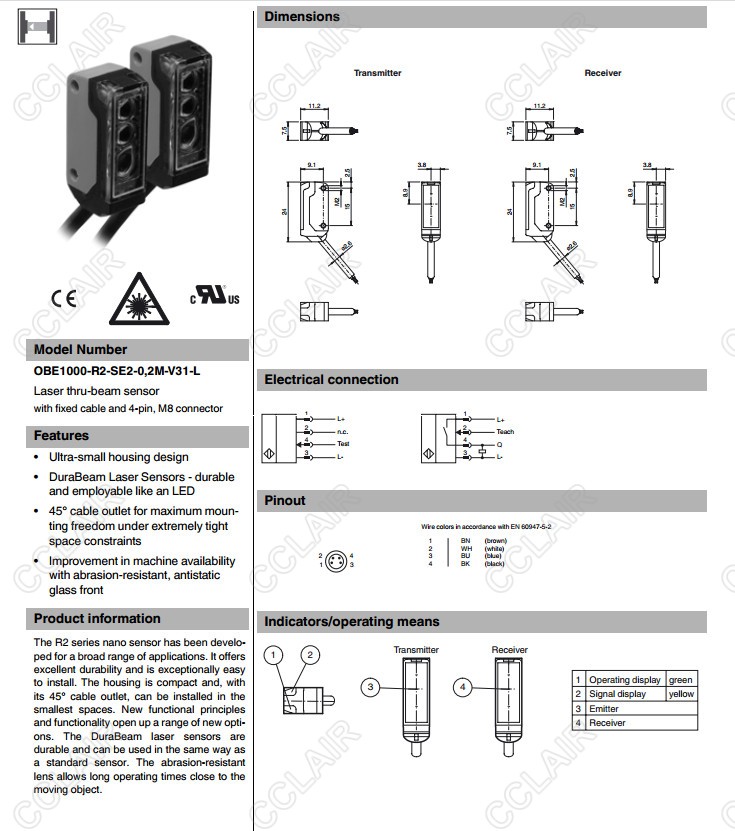 OBE1000-R2-SE2-0,2M-V3-L,OBE1000-R2-SE2-0,2M-V31-L,激光對(duì)射傳感器