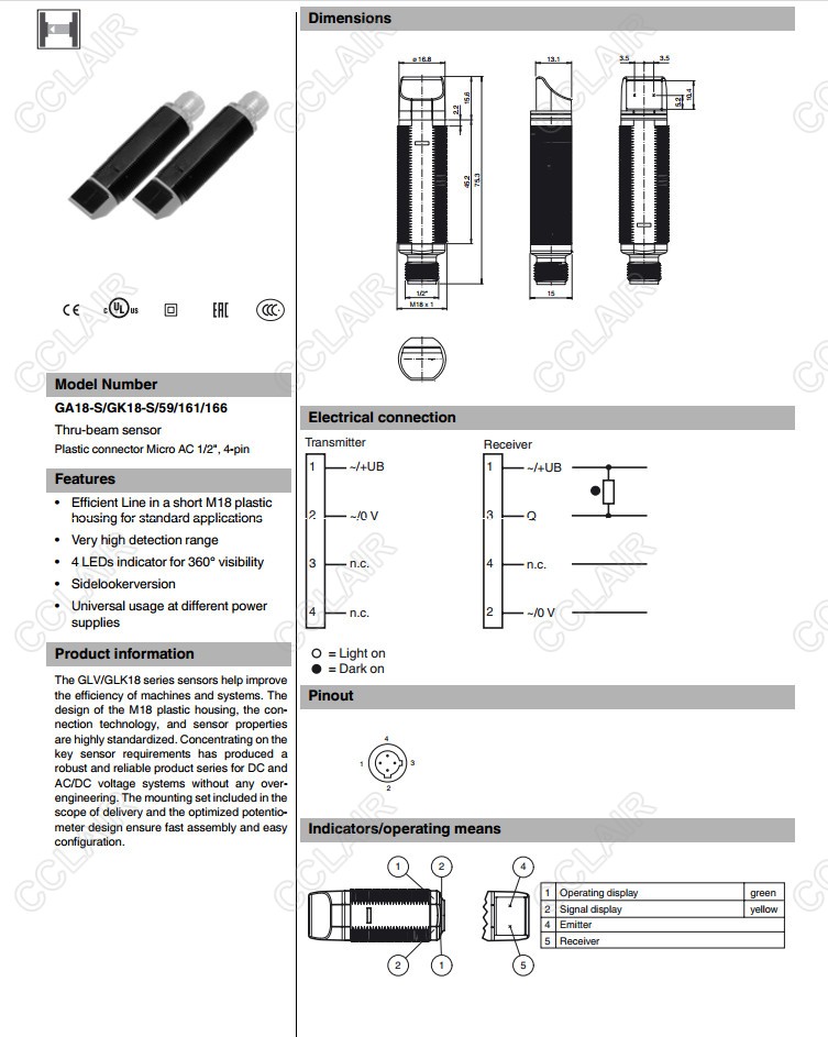 GA18-S/GK18-S/59/161/166,對(duì)射型傳感器