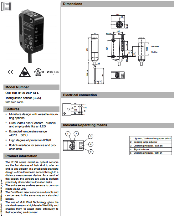 OBT100-R100-2EP-IO-L,漫反射型傳感器