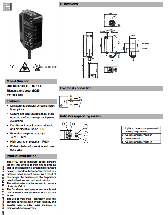 OBT100-R100-2EP-IO-1T-L,漫反射型傳感器