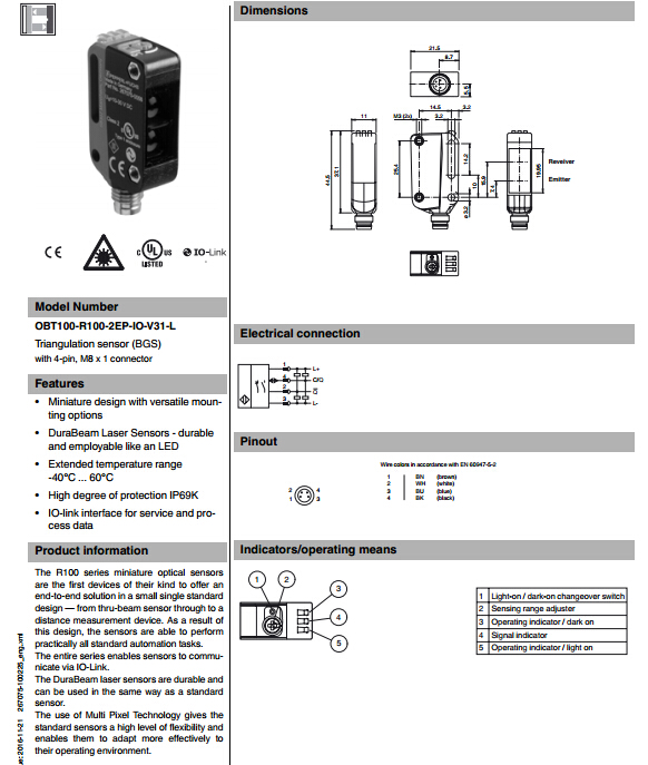 OBT100-R100-2EP-IO-V31-L,漫反射型傳感器