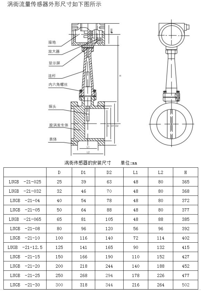 | 渦街傳感器的安裝尺寸 單位:mm | ||||||