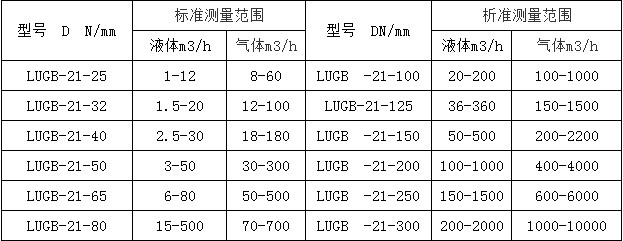 | 型號 D N/mm | 標準測量范圍 | 型號 DN/mm | 析準測量范圍 | ||