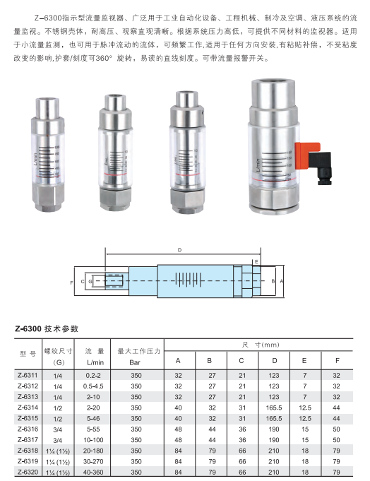 Z-6300指示型流量監(jiān)視器、廣泛用于工業(yè)自動化設(shè)備、工程機(jī)械、制冷及空調(diào)、液壓系統(tǒng)的流量監(jiān)視。不銹鋼殼體 ,耐高壓、觀察直觀清晰。根據(jù)系統(tǒng)壓力高低,可提供不同材料的監(jiān)視器 。適用于小流量監(jiān)測,也可用于脈沖流動的流體,可頻繁工作,適用于任何方向安裝,有粘貼補(bǔ)償,不受粘度 改變的影響,護(hù)套/刻度可360°旋轉(zhuǎn),易讀的直線刻度。