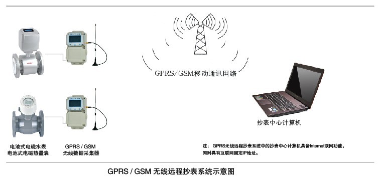 GPRS無線遠程抄表系統(tǒng)由:電池水表、GPRS無線數(shù)據(jù)采集器、GSM移動公網(wǎng)、Internet互聯(lián)網(wǎng)、具備互聯(lián)網(wǎng)固定IP地址的抄表中心計算機及中心計算機管理軟件組成。