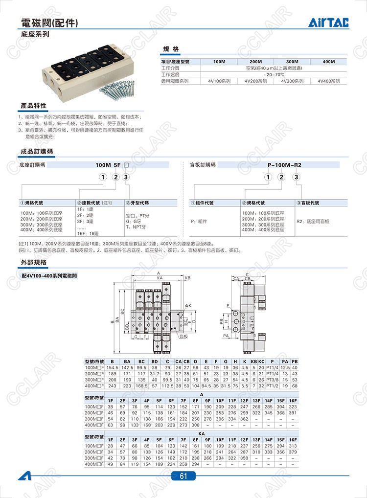 4V100M-1F,4V100M-2F,4V100M-3F,4V100M-4F,4V100M-5F,4V100M-6F,AIRTAC電磁閥底座