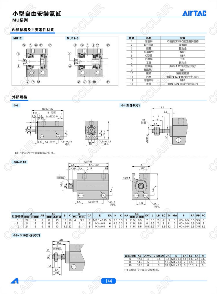 MU4*4,MU4*4-S,MU4*6,MU4*6-S,MSU4*4,MSU4*4-S,MSU4*6,AIRTAC亞德客小型自由安裝氣缸