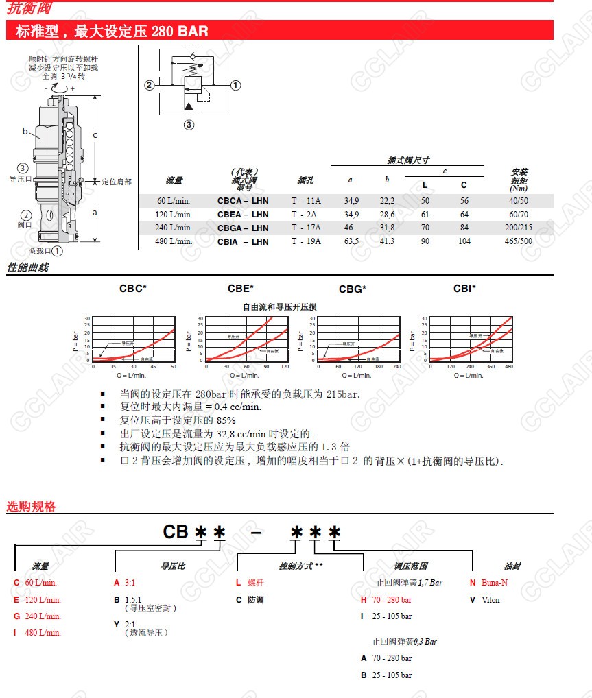 CBCA-LHN,CBEA-LHN,CBGA-LHN,CBIA-LHN,標(biāo)準(zhǔn)型, 較大設(shè)定壓280bar抗衡閥