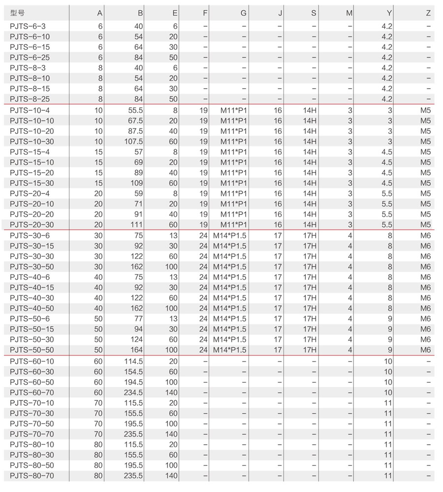 PJTS-6-3,PJTS-6-10,PJTS-6-15,PJTS-6-25,PJTS-8-3,PJTS-8-10,PJTS-8-15,PJTS-8-25,PJTS-10-4,PJTS-10-10,PJTS-10-20 PJTS-10-30,PJTS-15-4,PJTS-15-10,PJTS-15-20,PJTS-15-30,PJTS-20-4,PJTS-20-10,PJTS-20-20,PJTS-20-30,PJTS-30-6 PJTS-30-15,PJTS-30-30,PJTS-30-50,PJTS-40-6,PJTS-40-15,PJTS-40-30,PJTS-40-50,PJTS-50-6,PJTS-50-15,PJTS-50-30 PJTS-50-50,PJTS-60-10,PJTS-60-30,PJTS-60-50,PJTS-60-70,PJTS-70-10,PJTS-70-30,PJTS-70-50,PJTS-70-70,PJTS-80-10 PJTS-80-30,PJTS-80-50,PJTS-80-70
