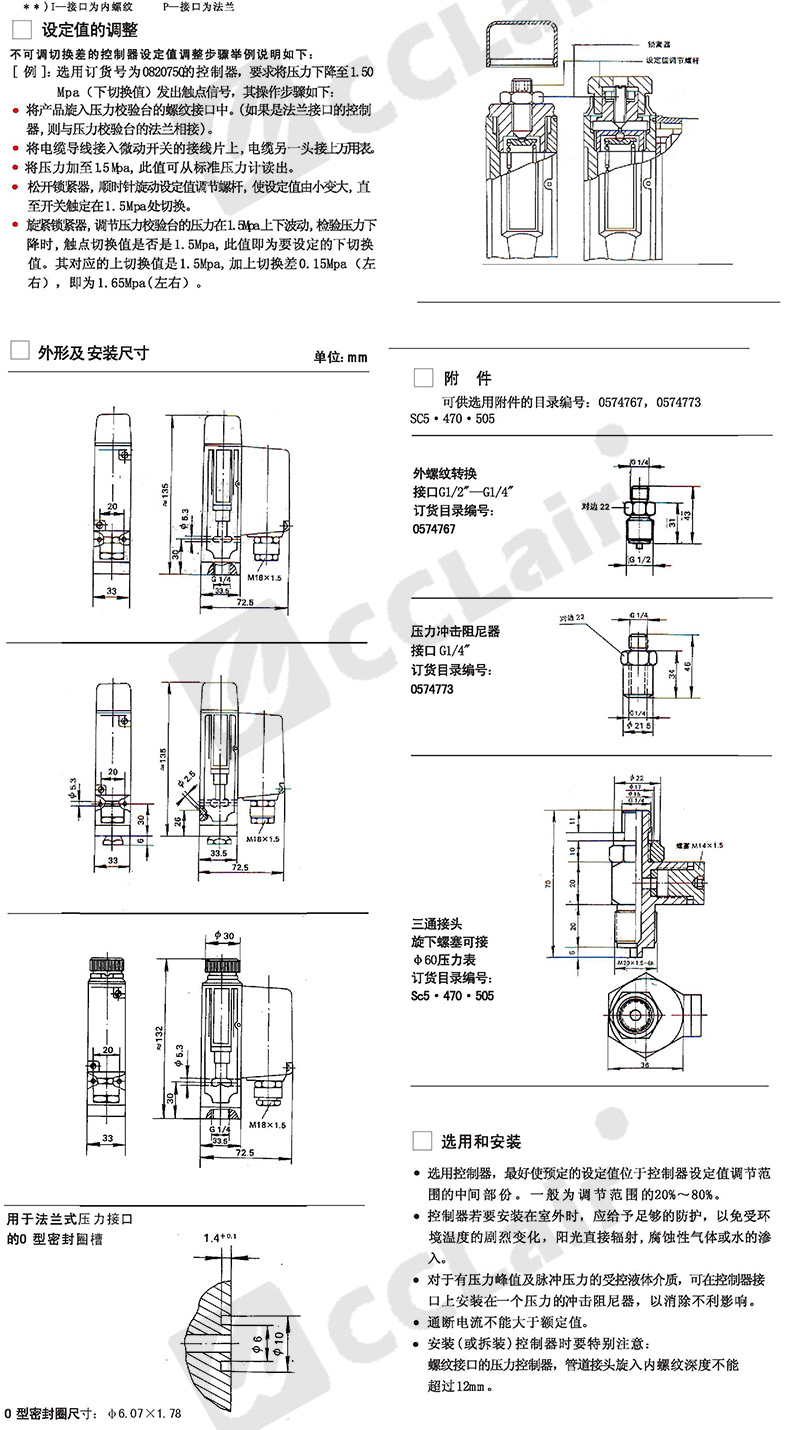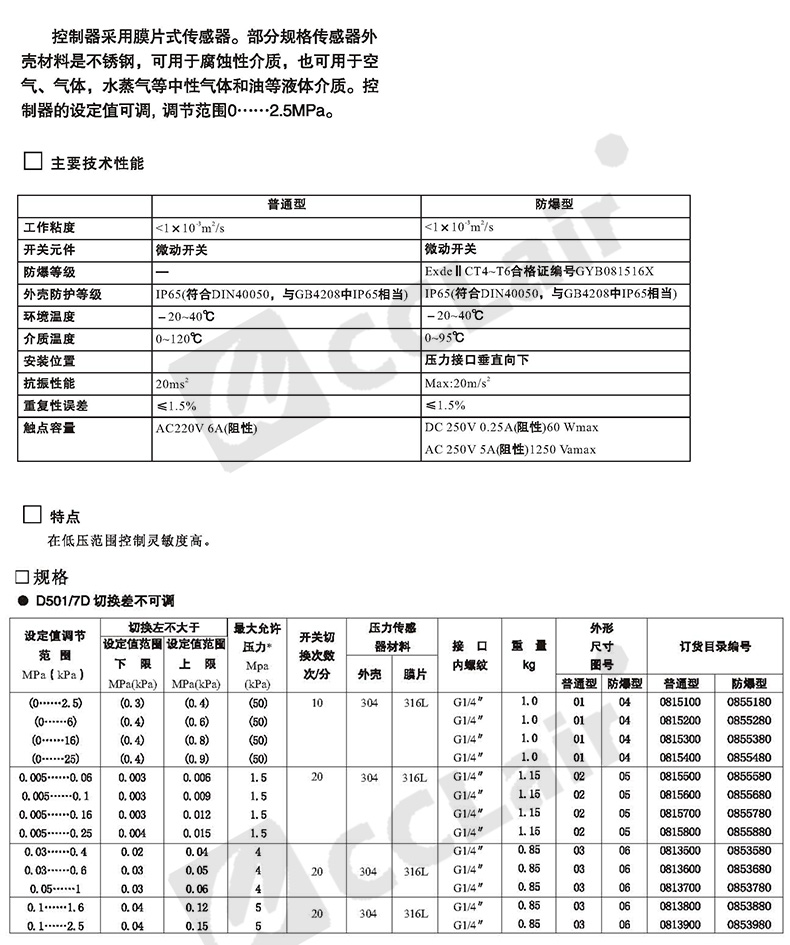 0815100,0813500,0815200,0813600,0815300,0813700,壓力控制器 普通 D501/7D切換差不可調(diào)