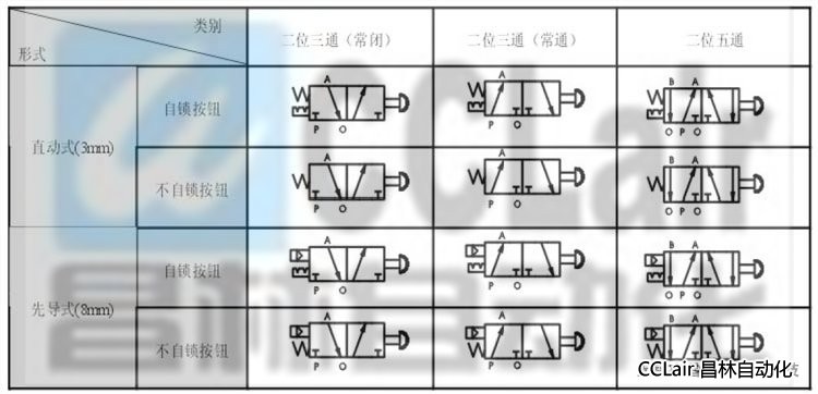 按鈕式人控閥分直動(dòng)式和先導(dǎo)式兩種,主要用作控制氣路的開關(guān)和改變控制氣路的方向,可發(fā)出氣信號(hào)給氣控?fù)Q向閥使其