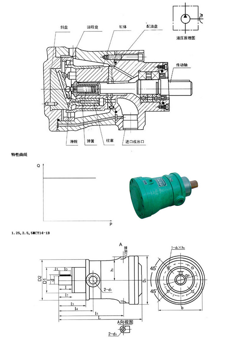 表示:排量為63毫升/轉(zhuǎn),壓力為31.5MPa的手動(dòng)變量的缸體旋轉(zhuǎn)的軸向柱塞油泵。