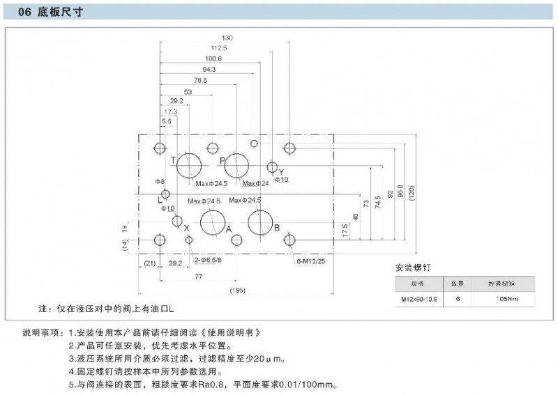 二、技術(shù)參數(shù):規(guī)格 06 10 最高工作壓力 (MPa) 31.5 最大流量 (L/min) 220 430 工作介質(zhì) 礦物質(zhì)液壓油;磷酸脂 介質(zhì)油溫范圍 (℃) -20~70 介質(zhì)粘度范圍 (mm2/s) 2.8~380 開(kāi)啟壓力 (MPa) a:0.05 b:0.4 工作電壓 (V) 直流 24 *交流 127, 220 防護(hù)等級(jí) IP55
