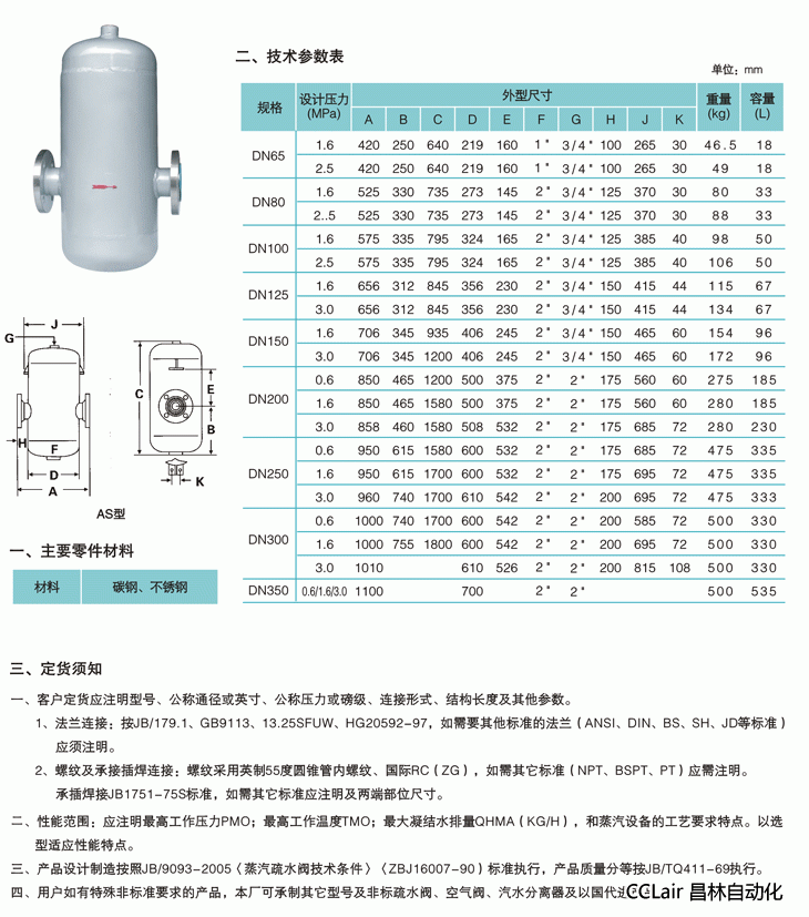 AS-PN1.6-DN65,AS-PN1.6-DN80,AS-PN1.6-DN100,AS-PN1.6-DN125,汽水分離器
