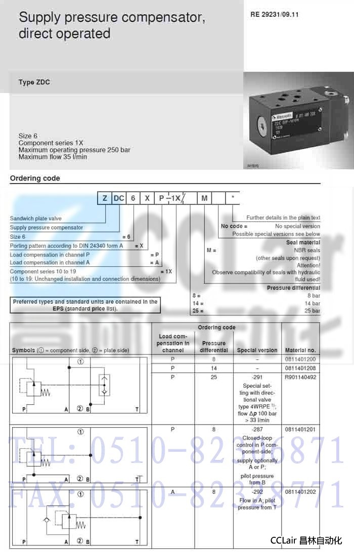 ZDC6XP-1X/8M,ZDC6XP-1X/14M,ZDC6XP-1X/25M,壓力補(bǔ)償器,力士樂REXROTH,德國力士樂