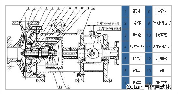 CQB-G型高溫磁力驅(qū)動(dòng)泵(簡(jiǎn)稱高溫磁力泵)通常由電機(jī),磁力耦合器,水冷卻裝置和耐腐蝕離心泵四大部分組成,其主要特點(diǎn)是利用磁力耦合器傳遞動(dòng)力。當(dāng)電動(dòng)機(jī)帶動(dòng)磁力耦合器的外磁鋼旋轉(zhuǎn)時(shí),磁力線穿過間隙和隔離套,作用于內(nèi)磁鋼上,使泵轉(zhuǎn)子與電動(dòng)機(jī)同步旋轉(zhuǎn),無機(jī)械接觸地傳遞扭矩。在泵的動(dòng)力輸入端,由于液體被封閉在靜止的隔離套內(nèi),沒有動(dòng)密封因而無泄漏。磁力耦合器的磁性材料采用耐高溫型稀土永磁材料,能承受280度以下的高溫介質(zhì)而保持強(qiáng)大的磁力扭矩。在電機(jī)與磁力耦合器之間加裝了水冷卻裝置,防止泵送高溫介質(zhì)之熱量傳導(dǎo)至電機(jī),以保持電機(jī)的正常運(yùn)行,從而達(dá)到無泄漏輸送高溫介質(zhì)。