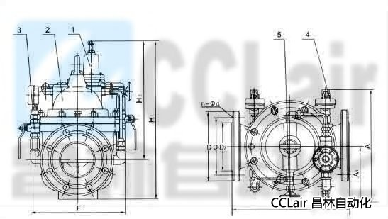 1、導閥2、主閥3、球閥4、壓力表5、針表