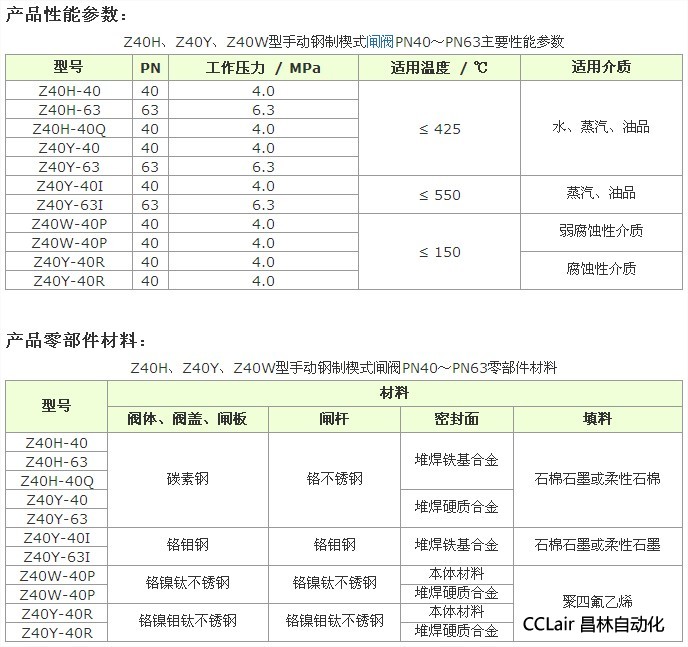 Z40H、Z40Y、Z40W 型 PN40、PN63 鋼制楔式閘閥:手動、法蘭連接、明桿楔式彈性閘板,閥座密封面材料為不銹鋼、硬質(zhì)合金,工作壓力 4.0~6.3MPa,閥體材料為碳素鋼(Z40H-40~63 Z40H-40Q Z40Y-40~63)、鉻鉬鋼(Z40Y-40I~63I)、鉻鎳鈦不銹鋼(Z40W-40P)、鉻鎳鉬鈦不銹鋼(Z40Y-40R)的閘閥。