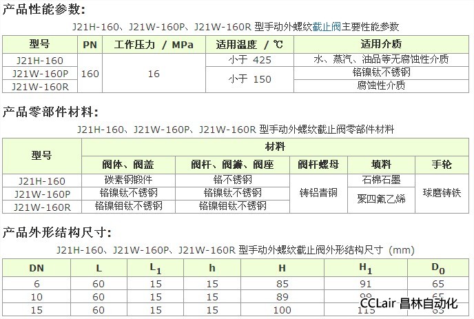 J21H-160、J21W-160P、J21W-160R 型外螺紋截止閥:手動(dòng)、外螺紋連接形式、直通式結(jié)構(gòu),閥座密封面材料為不銹鋼、工作壓力 16.0 MPa、公稱尺寸 DN6~DN15、閥體材料為碳素鋼(J21H)、不銹鋼(J21W),適用于水、蒸汽、油品(J21H),弱腐蝕性或腐蝕性(J21W)介質(zhì)管路中。