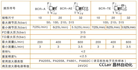 BCR是錐閥型先導(dǎo)式比例溢流閥,閥的壓力與輸入電信號(hào)成正比。此類閥工作時(shí)是通過(guò)電子放大器提供比例電磁鐵的驅(qū)動(dòng)電流,調(diào)整閥的工作壓力。