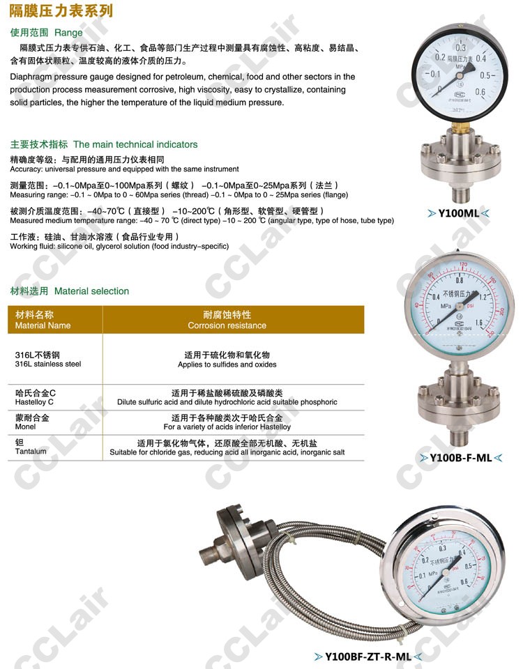 Y100ML,Y100B-F-ML,Y100BF-ZT-R-ML,YN60PP,Y100BF-MF,YXC100BF-MF,隔膜壓力表,無錫昌林