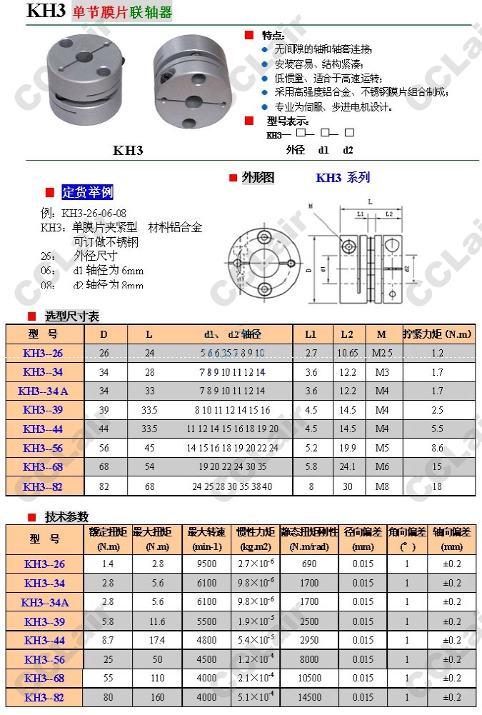 KH3-26,KH3-34,KH3-34A,KH3-39,KH3-44,KH3-56,KH3-68,KH3-82,鋁合金單節(jié)膜片聯(lián)軸器