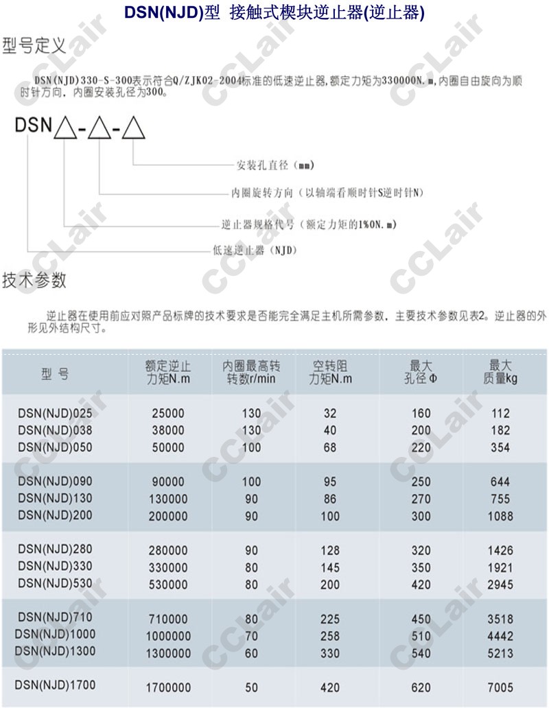 DSN330,DSN530,DSN710,DSN1000,DSN1300,DSN1700,NJD330,NJD530,NJD710,NJD1000,NJD1300,NJD1700,接觸式楔塊逆止器