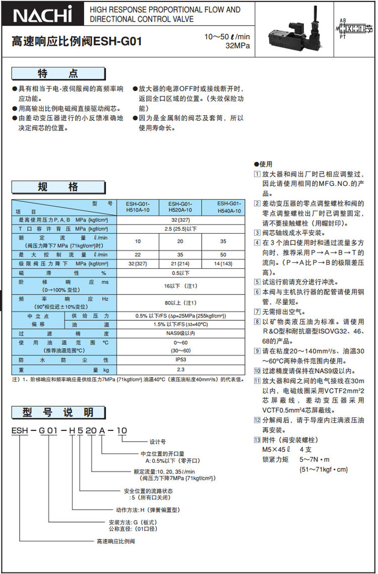 ESH-G01-H510A-10,ESH-G01-H520A-10,ESH-G01-H540A-10,NACHI高速響應(yīng)比例閥