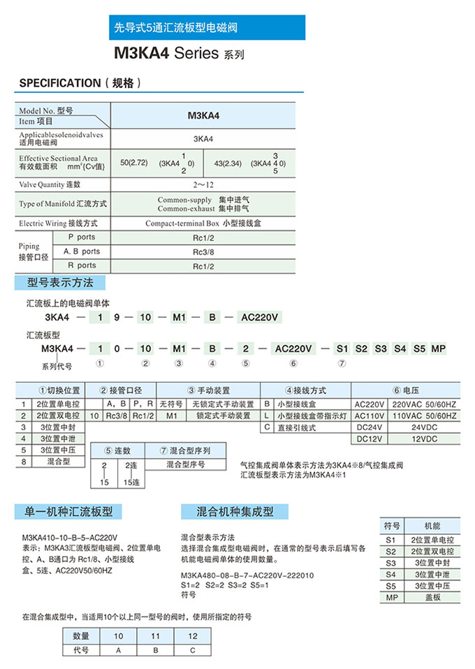 M3KA410-10,M3KA420-10,M3KA430-10,M3KA440-10,M3KA450-10,M3KA480-10,M3KA410-10-B,先導(dǎo)式5通匯流板型電磁閥