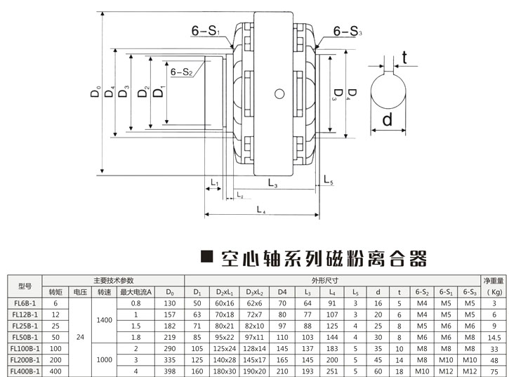 FL6B-1,FL12B-1,FL25B-1,FL50B-1,FL100B-1,FL200B-1,FL400B-1,空心軸磁粉離合器